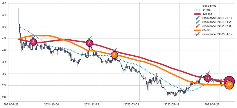 ➢ 34小时均线于(2022-07-20: 2.706)形成【死叉】基于【死叉历史模型】预测死叉后最低波谷价格: 2.493, 死叉后最低价格2.370,已经下跌超出预测最低波谷价格, 预期反弹