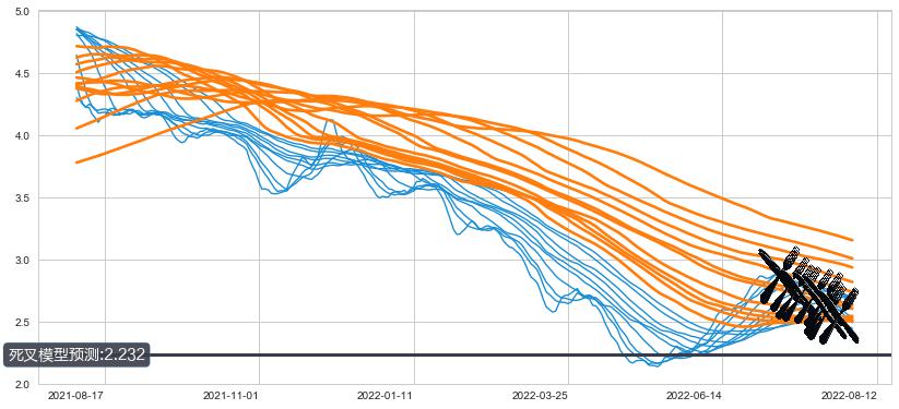 ➣ 70小时均线于(2022-08-05: 2.527)形成【死叉】基于【死叉历史模型】预测死叉后最低波谷价格: 2.005, 死叉后最低价格2.370,尚未达到预测最低波谷价格, 预期继续下跌