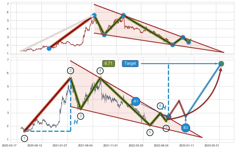 ➢ 最小中继整理跌幅→𝐇: 2.340 (𝐇楔型旗杆的长度:楔型起点→顶点)