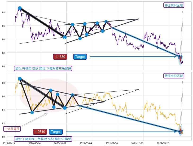 ➣ 单针探底(定海神针) + 下降对称三角整理target支撑拐点上涨信号叠加后【目标达成率】低,【看多】信号叠加【存续影响大】