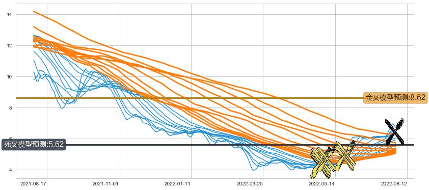 ➣ 21小时均线于(2022-08-11: 6.34)形成【死叉】基于【死叉历史模型】预测死叉后最低波谷价格: 5.42, 死叉后最低价格6.34,已经下跌超出预测最低波谷价格, 预期反弹