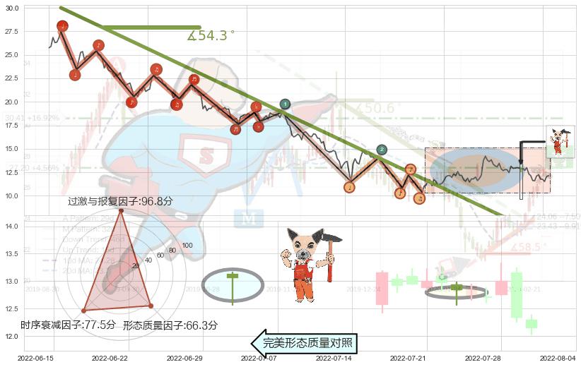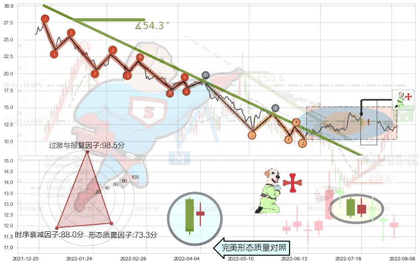 从2021-08-10至2022-01-20,共包含113个交易日,阶段股价下跌-35.02%,阶段股价变动位移路程比: 1 : 5,下跌趋势角度: 49.9