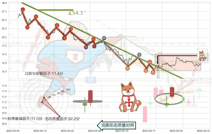 从2021-08-10至2022-05-19,共包含189个交易日,阶段股价下跌-82.96%,阶段股价变动位移路程比: 1 : 4,下跌趋势角度: 54.3