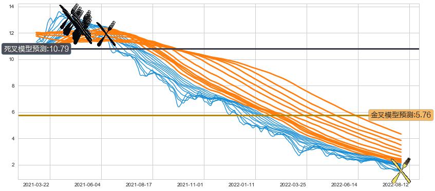 ➢ 40小时均线于(2021-04-27: 12.70)形成【死叉】基于【死叉历史模型】预测死叉后最低波谷价格: 11.08, 死叉后最低价格1.4500,已经下跌超出预测最低波谷价格, 预期反弹