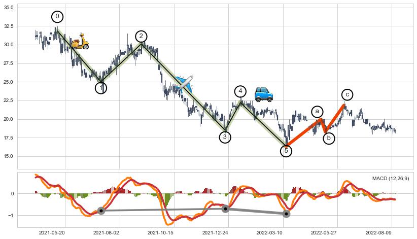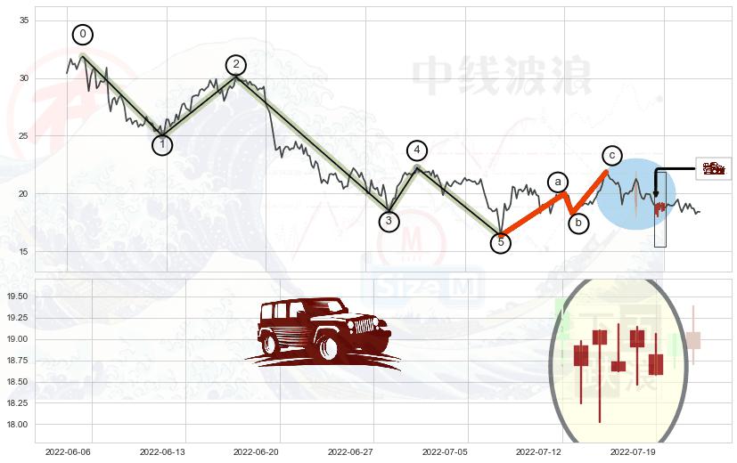 ➣ 波浪理论:猜想达到c点后小反弹终止反转下跌 → 下跌 → 【拐点】临近 → 阶段均值回复结束后继续大周期趋势跟踪