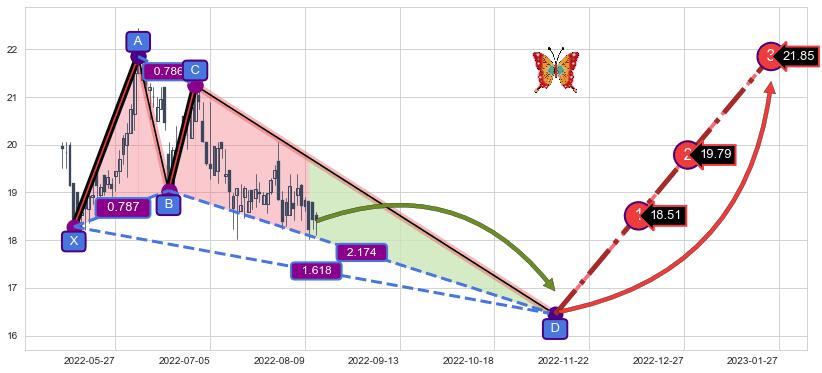➣ 未完成【蝴蝶】形态起点X: 2022-05-12, 已到达C点: 2022-06-28, 预测最终D点: 2022-11-09, 共126交易日