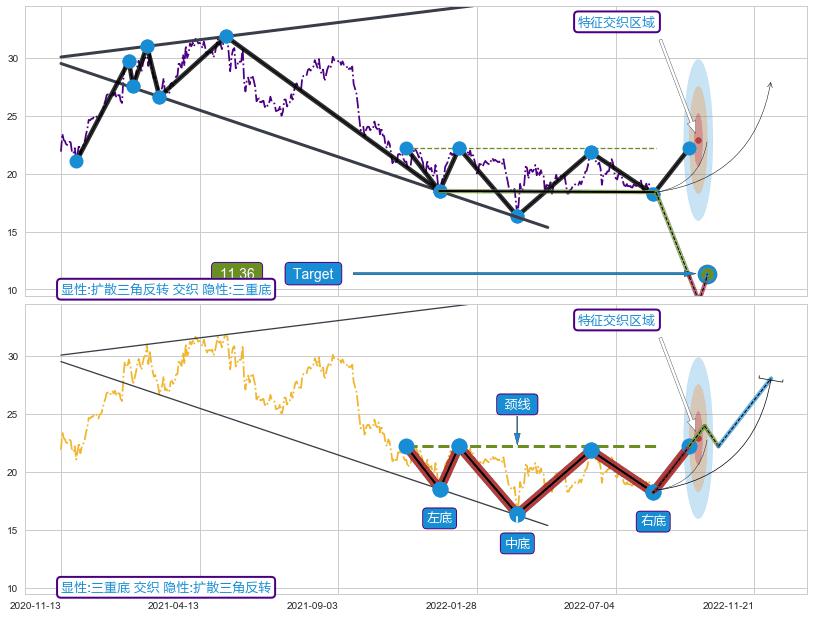 ➢ 扩散三角反转:猜想预期下跌目标target即将达成,随后猜想强支撑来临,预期反弹上涨(均值回复)