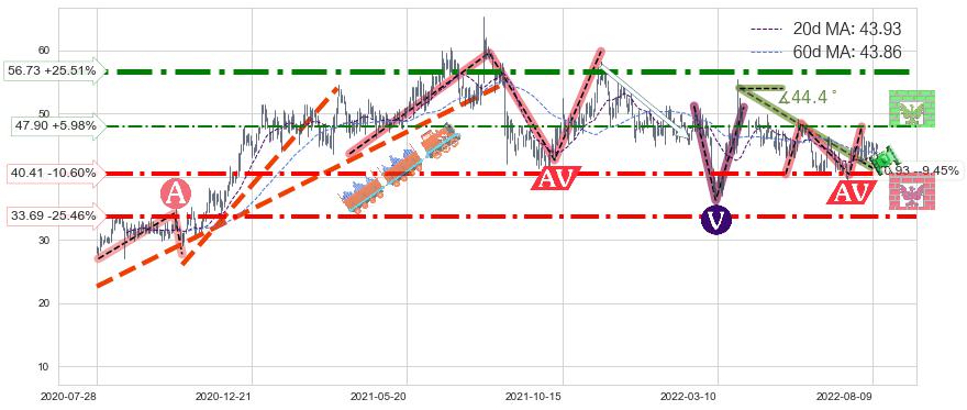 ♘ 阻力价格位47.90,可信任强度47.63%,距离最后交易2022-08-12形成的收盘价格45.20相差 +5.98%