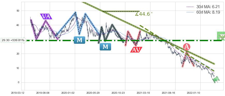 ♘ 阻力价格位29.30,可信任强度99.00%,距离最后交易2022-03-31形成的收盘价格4.58相差 +539.81%