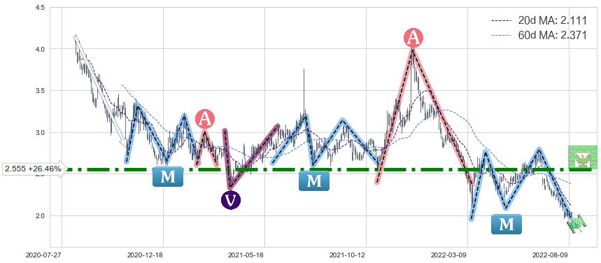 ♘ 阻力价格位2.555,可信任强度92.01%,距离最后交易2022-08-12形成的收盘价格2.020相差 +26.46%