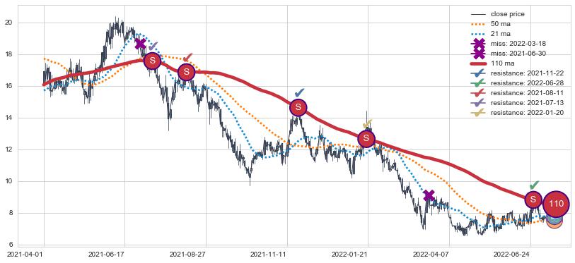 ➣ 70小时均线于(2021-07-13: 17.45)形成【死叉】基于【死叉历史模型】预测死叉后最低波谷价格: 15.49, 死叉后最低价格5.83,已经下跌超出预测最低波谷价格, 预期反弹