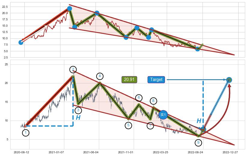 ➣ AI预测: 假定反转启动后, 第❸目标位置(2023-09-07, 21.80)