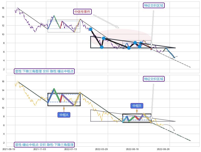 ➢ 下降三角整理属【中级别信号事件】缠论中枢点属【长级别信号事件】中长周期组合信号事件,中长事件长度比42.13%