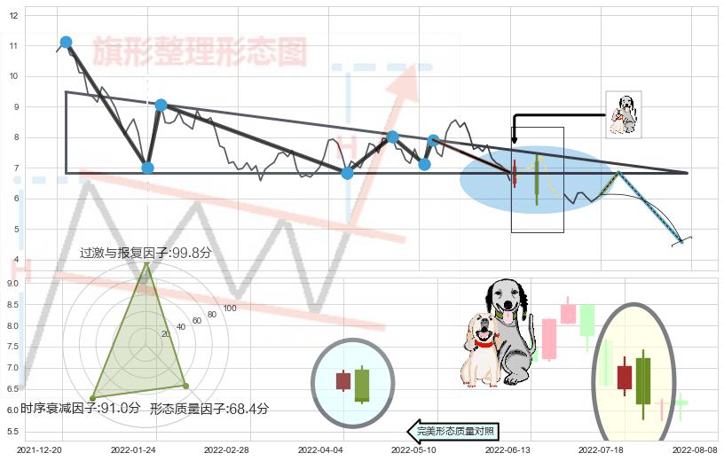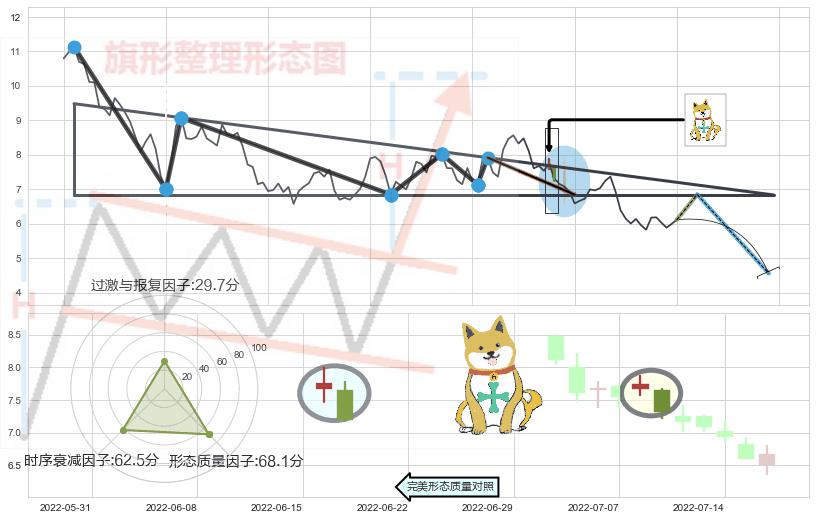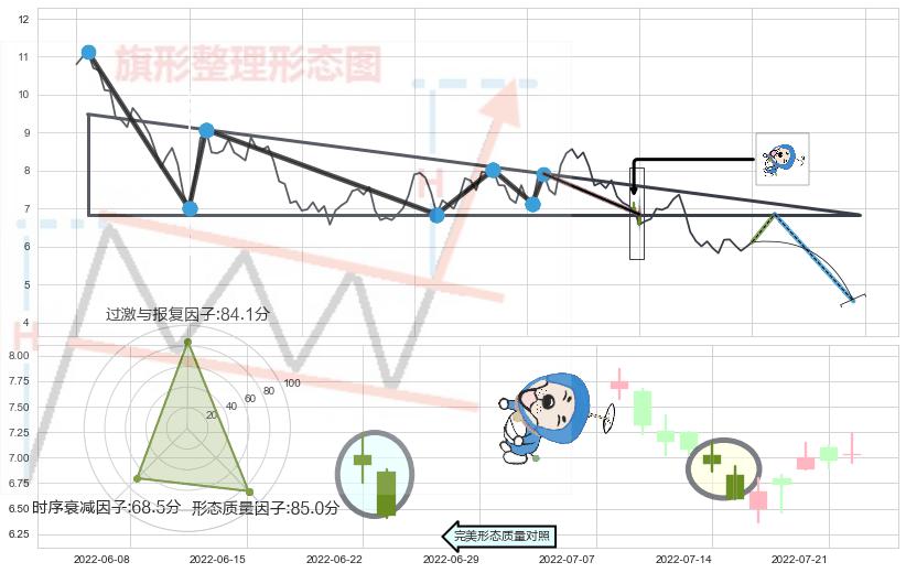 ➢ 【多方力量耗尽,空方打破攻守平衡点】下降三角形中继整理, 已在2022-07-15突破【支撑】颈线 6.85 →演变成下降通道