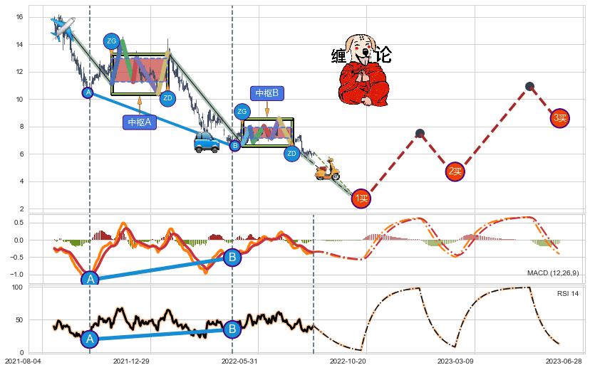 ➣ 缠论中枢点:猜想破位中枢B后持续下拉 → 下跌 → 破位中枢B支撑 → 持续趋势跟踪
