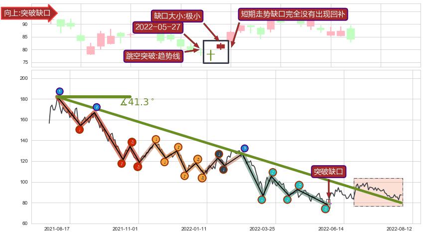 从2021-08-04至2022-06-07,共包含205个交易日,阶段股价下跌-59.28%,阶段股价变动位移路程比: 1 : 8,下跌趋势角度: 41.3