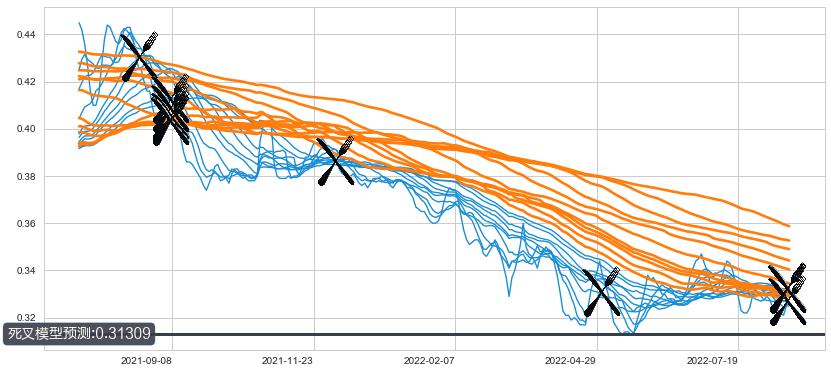 ➢ 55小时均线于(2022-08-11: 0.33191)形成【死叉】基于【死叉历史模型】预测死叉后最低波谷价格: 0.29220, 死叉后最低价格0.32500,尚未达到预测最低波谷价格, 预期继续下跌