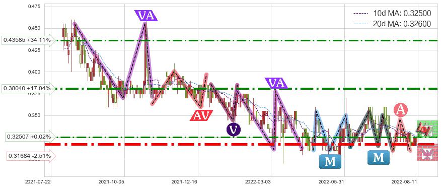 ♘ 阻力价格位0.43585,可信任强度60.04%,距离最后交易2022-08-12形成的收盘价格0.32500相差 +34.11%