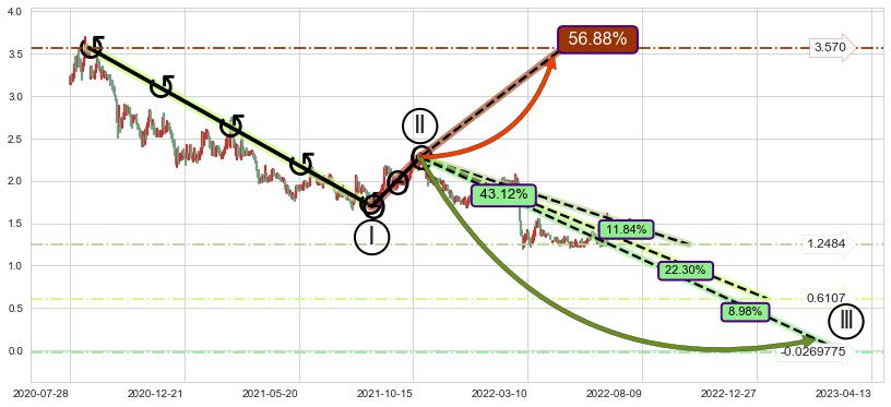 ➣ 调整浪已超过预测的c点位置,但后续大趋势循环浪高概率反转上涨,继续下跌概率43.12%,谨慎做空