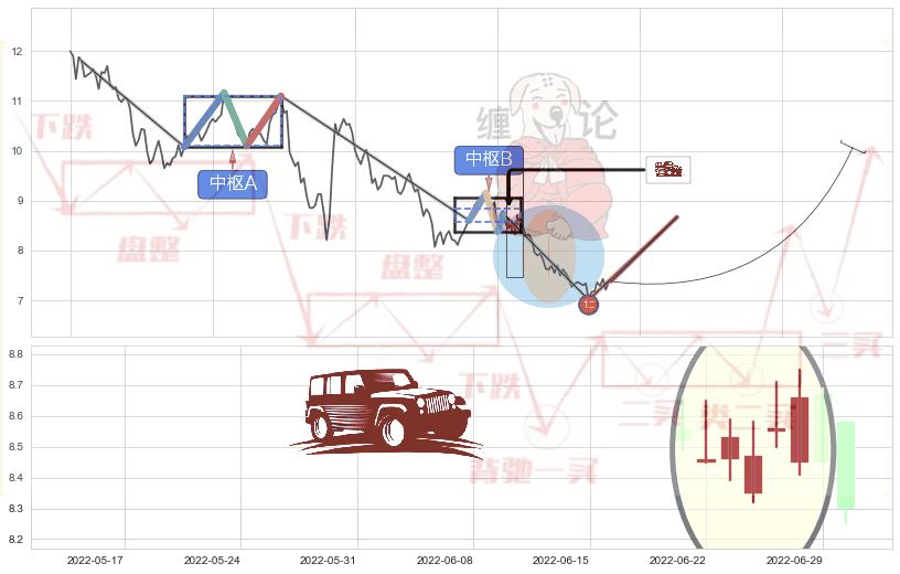 ➣ 【中枢B】:2022-06-01-2022-06-20,中枢由4笔构成,共13交易日, ZG=8.74, ZD=8.60
