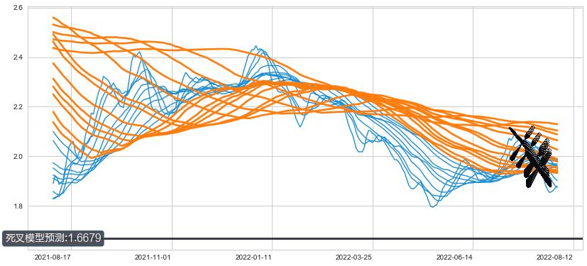 ➣ 70小时均线于(2022-07-29: 1.9409)形成【死叉】基于【死叉历史模型】预测死叉后最低波谷价格: 1.6003, 死叉后最低价格1.8300,尚未达到预测最低波谷价格, 预期继续下跌