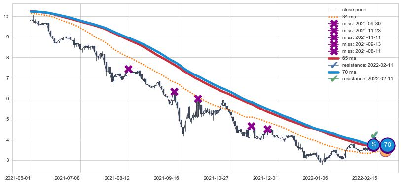 ➣ 70小时均线于(2021-04-20: 10.12)形成【死叉】基于【死叉历史模型】预测死叉后最低波谷价格: 9.31, 死叉后最低价格1.5100,已经下跌超出预测最低波谷价格, 预期反弹