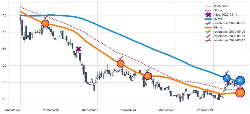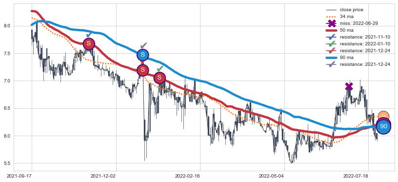 ➣ 34小时均线于(2022-07-20: 6.33)形成【死叉】基于【死叉历史模型】预测死叉后最低波谷价格: 5.89, 死叉后最低价格5.87,虽然已经到达预测最低波谷价格,但耗时间很短动能很强, 预期继续下跌