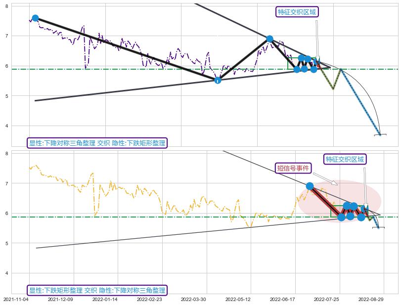➢ 【未确认突破,预测即将形成突破】下降【对称】三角形整理起点:2021-11-10, 预测突破点:2022-08-12,形态共186交易日
