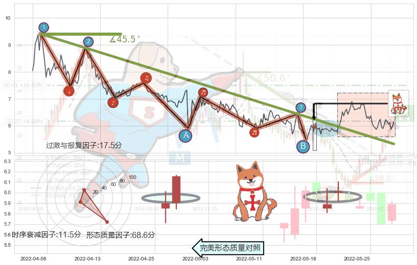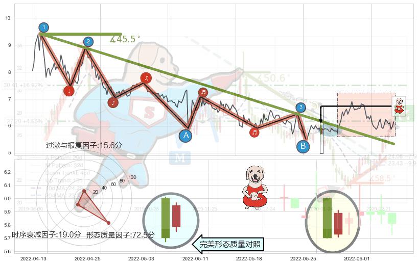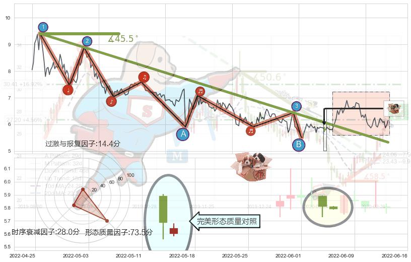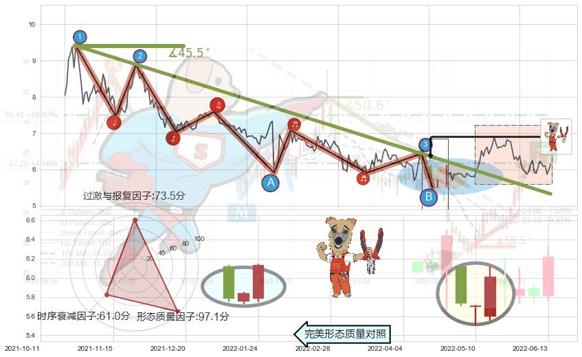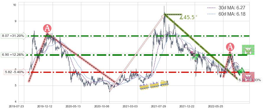 ➢ 2021-07-21-2022-06-28下跌趋势存在反转上涨[机会],其原下跌趋势的阻力位(5.33)已被突破[强支撑信号],原下跌趋势角度: 45.5˚