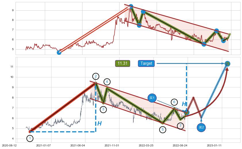 ➢ 最小中继整理跌幅→𝐇: 2.213 (低点逐步抬高斜边第一支撑点②与阻力边垂直距离)