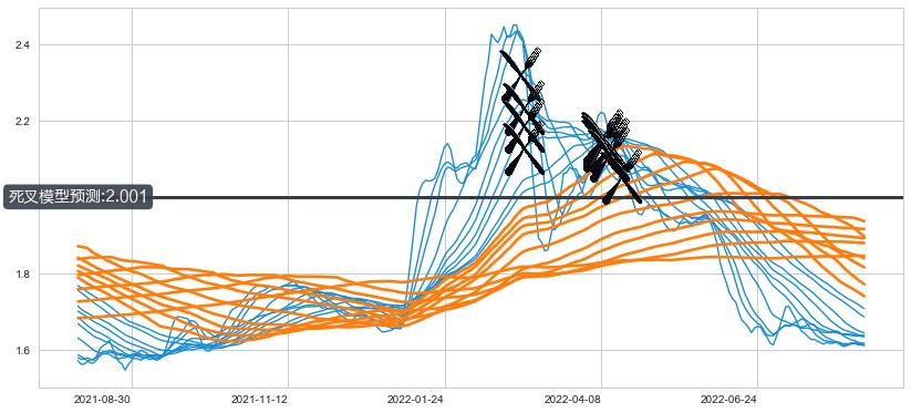 ➣ 70小时均线于(2022-04-12: 2.107)形成【死叉】基于【死叉历史模型】预测死叉后最低波谷价格: 1.9849, 死叉后最低价格1.5800,已经下跌超出预测最低波谷价格, 预期反弹