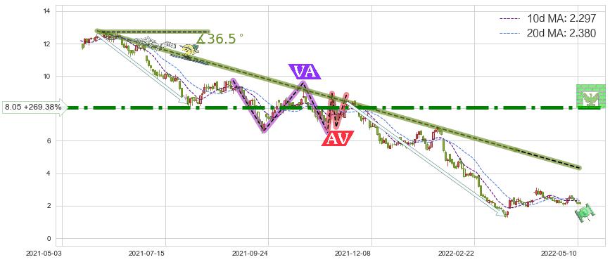 ♘ 阻力价格位8.05,可信任强度93.78%,距离最后交易2022-05-11形成的收盘价格2.180相差 +269.38%