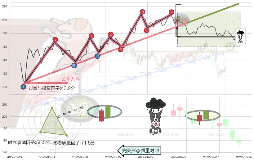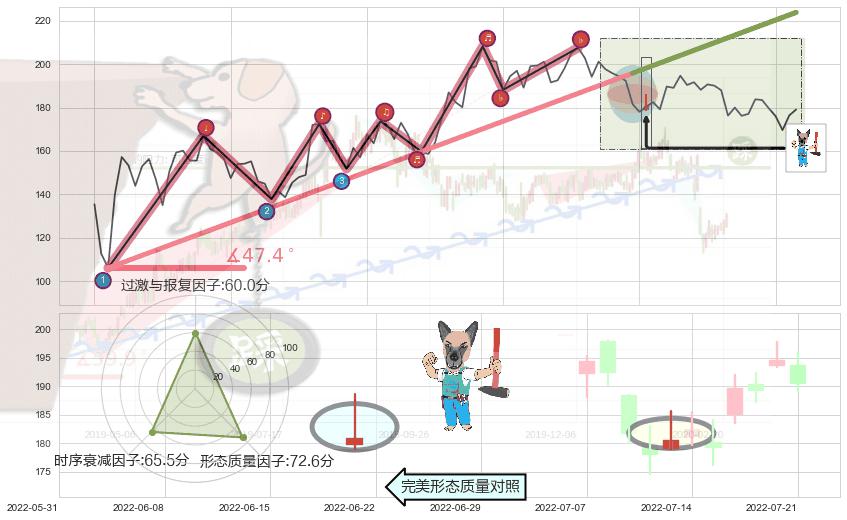 从2022-03-15至2022-07-11,共包含78个交易日,阶段股价上涨66.33%,阶段股价变动位移路程比: 1 : 4,上涨趋势角度: 47.4