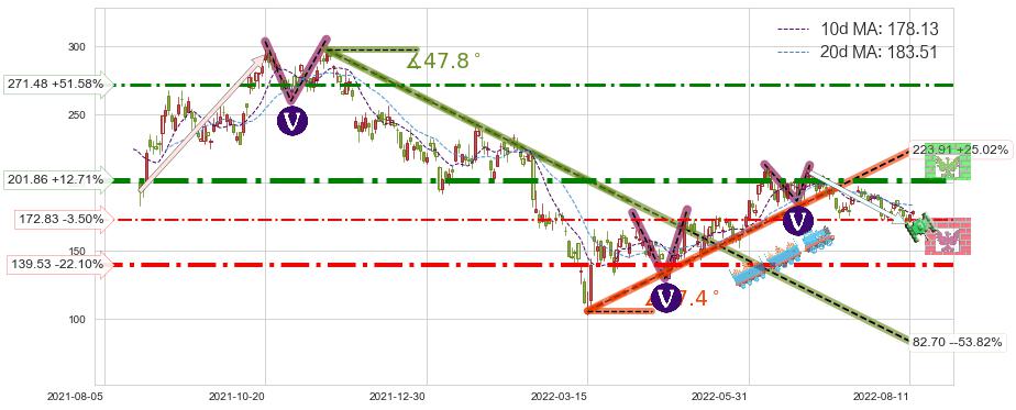 ♘ 阻力价格位201.86,可信任强度88.59%,距离最后交易2022-08-12形成的收盘价格179.10相差 +12.71%