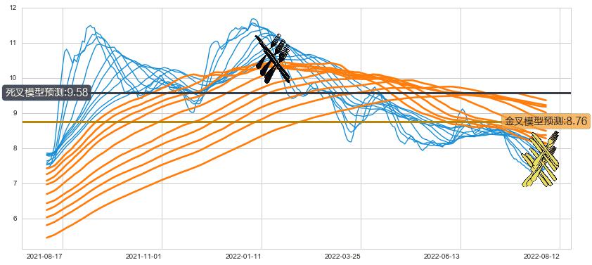 ➢ 80小时均线于(2022-01-20: 10.32)形成【死叉】基于【死叉历史模型】预测死叉后最低波谷价格: 9.78, 死叉后最低价格7.13,已经下跌超出预测最低波谷价格, 预期反弹