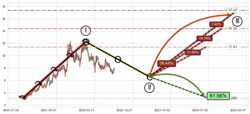 ➢ AI预测: 假定反转启动后, 第❷目标位置(2023-04-11, 9.90)