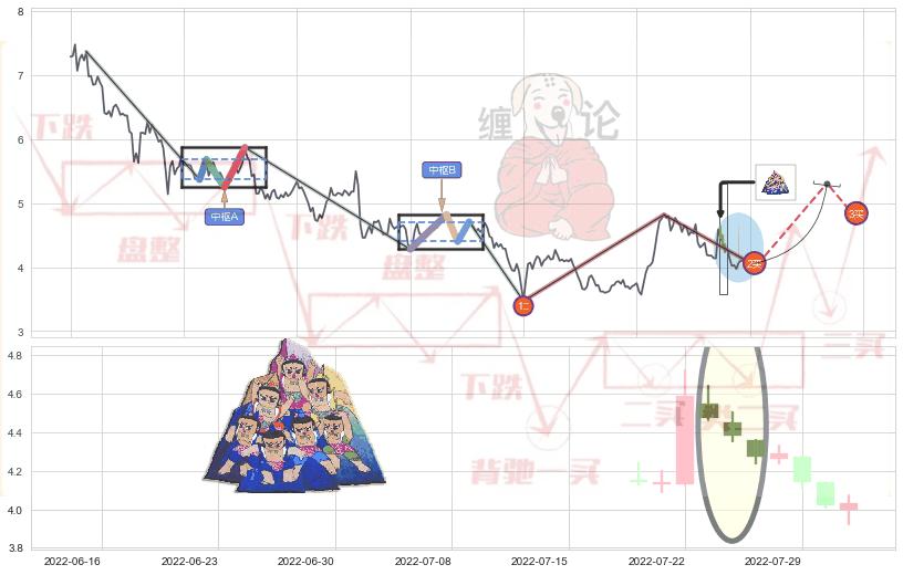 ➣ 【中枢B】:2021-12-30-2022-02-09,中枢由4笔构成,共27交易日, ZG=4.71, ZD=4.40