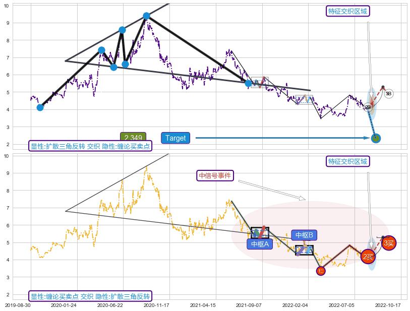 ➣ 扩散三角反转:猜想下跌target达成后 → 上涨 → 机会信号 → 大趋势均值回复