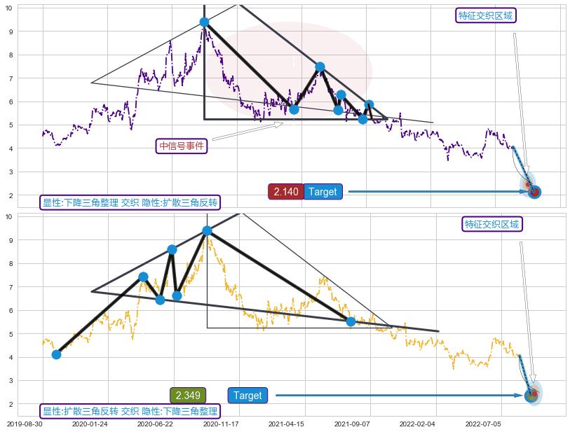 ➢ 扩散三角反转:猜想预期下跌目标target即将达成,随后猜想强支撑来临,预期反弹上涨(均值回复)