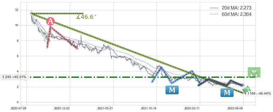 ♘ 阻力价格位3.240,可信任强度79.70%,距离最后交易2022-08-12形成的收盘价格2.170相差 +49.31%