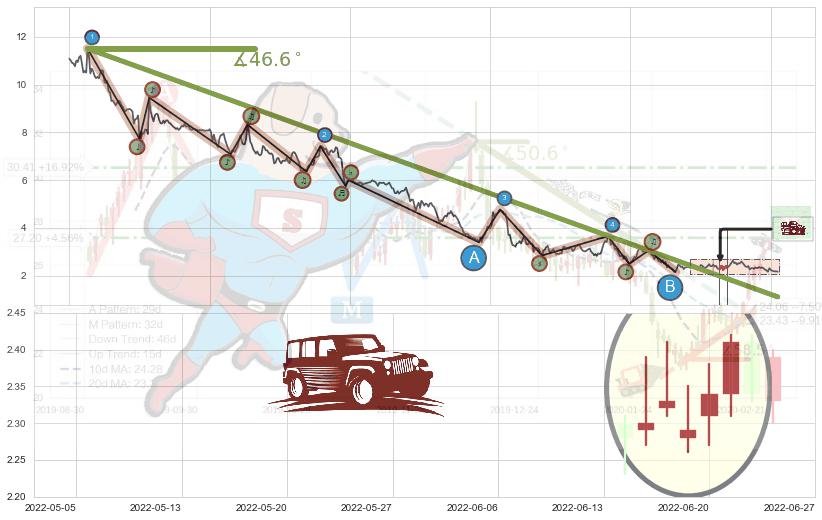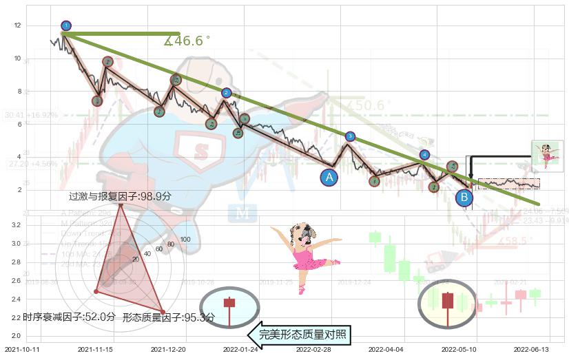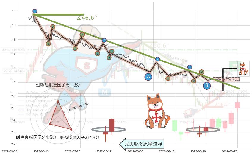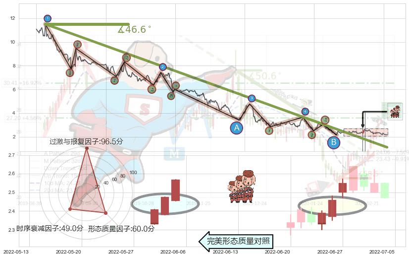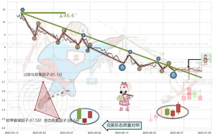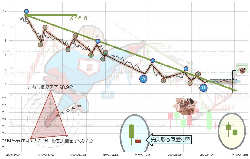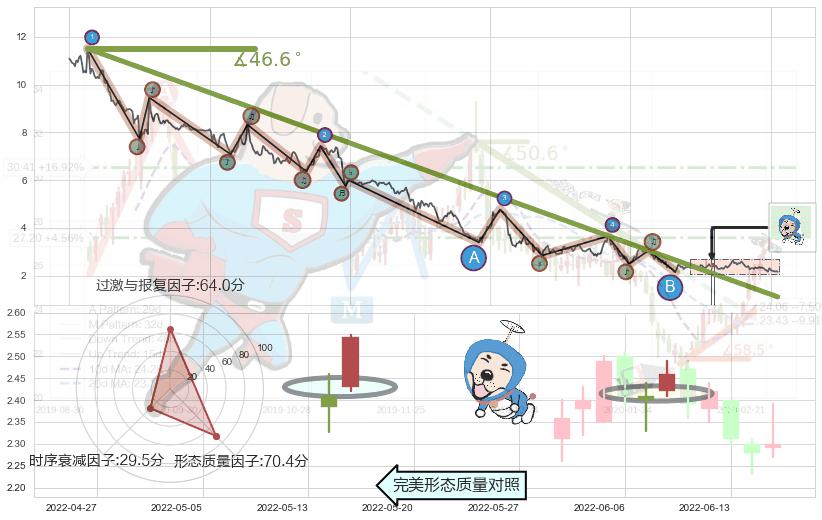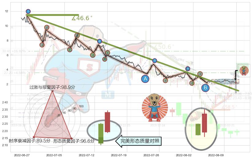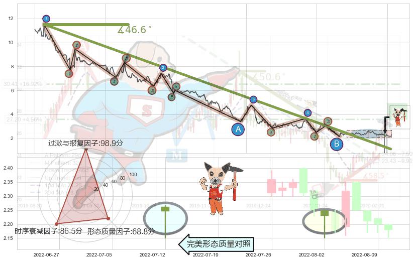 从2020-08-13至2022-06-27,共包含460个交易日,阶段股价下跌-128.19%,阶段股价变动位移路程比: 1 : 7,下跌趋势角度: 46.6