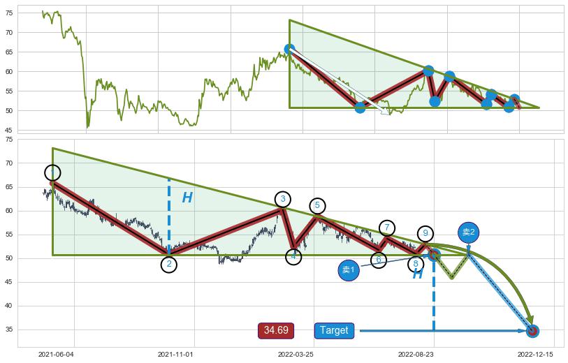 ➣ 【未确认突破,预测即将形成突破】下降三角形整理起点:2021-05-10, 预测突破点:2022-08-23,形态共319交易日