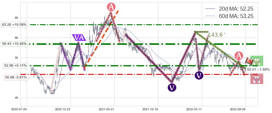 ♘ 支撑价格位50.88,可信任强度64.47%,距离最后交易2022-08-12形成的收盘价格52.90相差 -3.81%