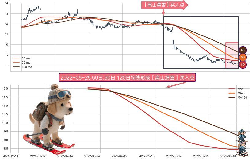 形态多维评估: ⚀ 2022-03-01日-2022-08-12日显现 60日-90日-120日均线 【高山滑雪】买入点 看多信号,后市看涨,买入