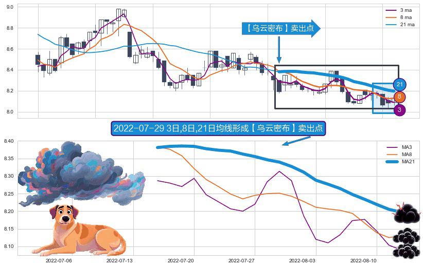 形态多维评估: ⚀ 2022-07-15日-2022-08-12日显现 3日-8日-21日均线 【乌云密布】卖出点 看空信号,后市看跌,卖出