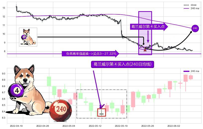 形态多维评估: ⚀ 2022-05-12-日显现 葛兰威尔均线 240日均线 第④买入点 下降趋势均值回复的短线反弹信号,后市看涨,买进信号
