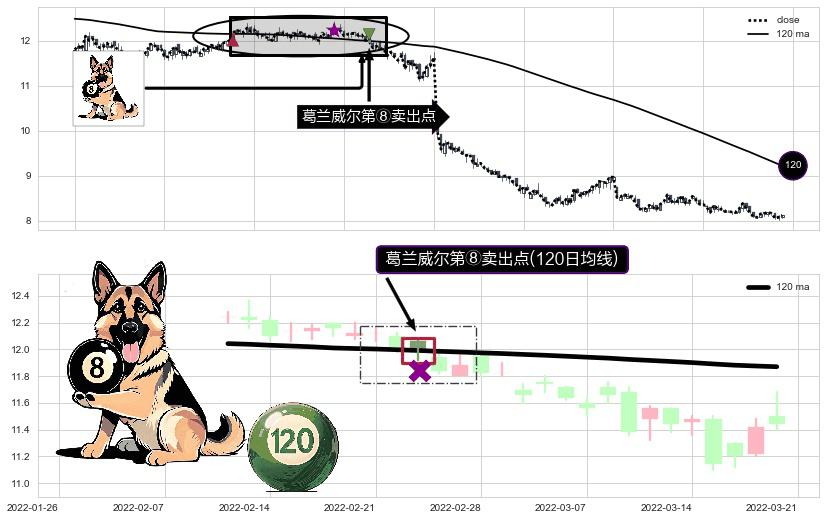 形态多维评估: ⚀ 2022-02-23-日显现 葛兰威尔均线 120日均线 第⑧卖出点 下降趋势的中继信号,后市看跌,卖出信号