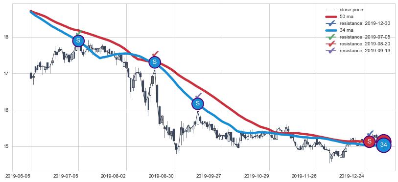 下跌趋势2019-06-05-2020-01-03,均线50, 34确认关键阻力4处