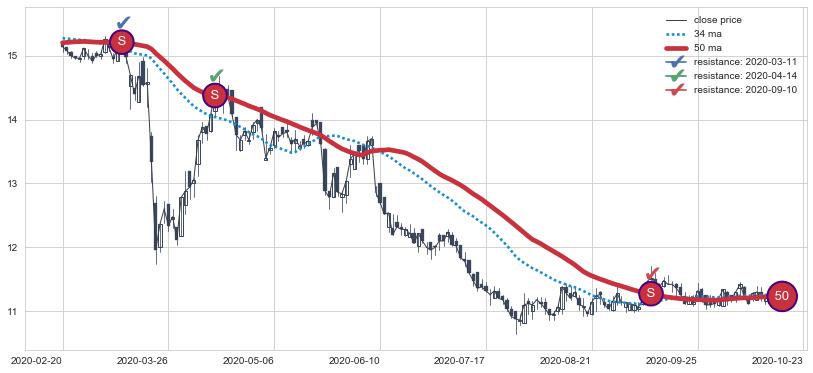 下跌趋势2022-02-18-2022-08-12,均线50, 34确认关键阻力3处