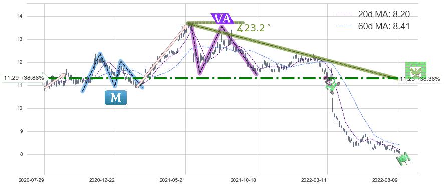 从2021-05-26至2022-08-12,共包含301个交易日,阶段股价下跌-48.83%,阶段股价变动位移路程比: 1 : 5,下跌趋势角度: 23.2,2022-03-22向↘︎形成缺口,跳空下跌-14.11%˚